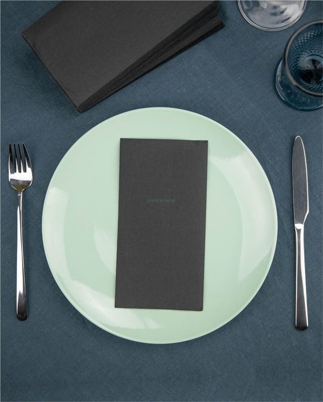 Czarne serwetki najlepiej prezentują się tam, gdzie mają zbudować kontrast albo podkreślić elegancki charakter stołu. Można zestawić je z białą porcelaną dla wyrazistego, nowoczesnego efektu albo połączyć z złotymi, srebrnymi lub drewnianymi dodatkami, aby uzyskać aranżację bardziej premium. Dobrze wyglądają także z ciemnym szkłem, czarnymi podkładkami i świecami. Dzięki składanej formie można je położyć klasycznie obok talerza, wsunąć pod sztućce, umieścić w pierścieniu do serwetek lub wykorzystać jako dopracowany detal przy serwowaniu menu na specjalne okazje.