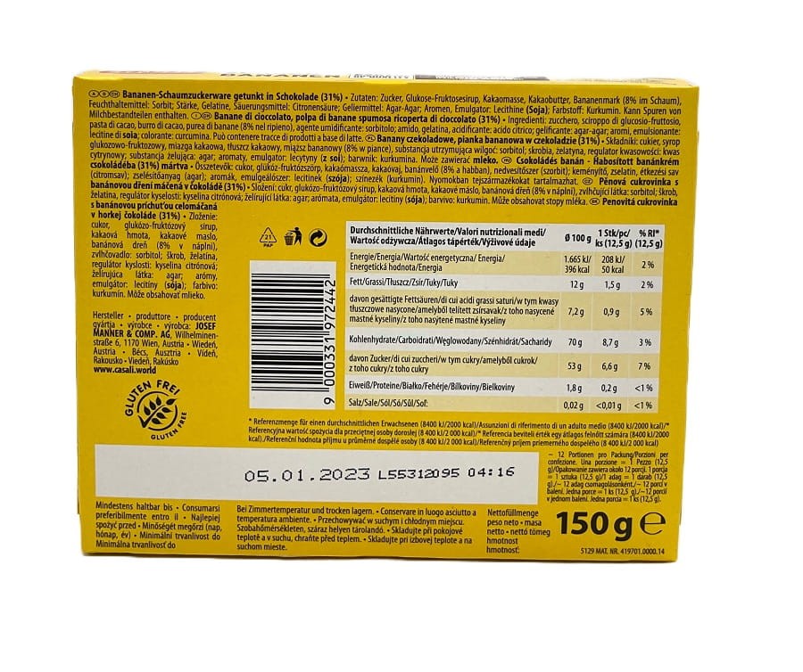 Składniki: cukier, syrop glukozowo-fruktozowy, miazga kakaowa, masło kakaowe, miazga bananowa (8% w piance), substancja utrzymująca wilgoć: sorbitol; skrobia, żelatyna, środek zakwaszający: kwas cytrynowy; środek żelujący: agar-agar; aromaty, emulgator: lecytyny (SOJA); Barwnik: kurkumina. Może zawierać śladowe ilości składników mleka. Miąższ kakaowy, cukier, banan uprawiany, sprzedawany i testowany zgodnie ze standardami Fairtrade. (kakao i cukier z bilansem objętościowym) łączny udział 58%