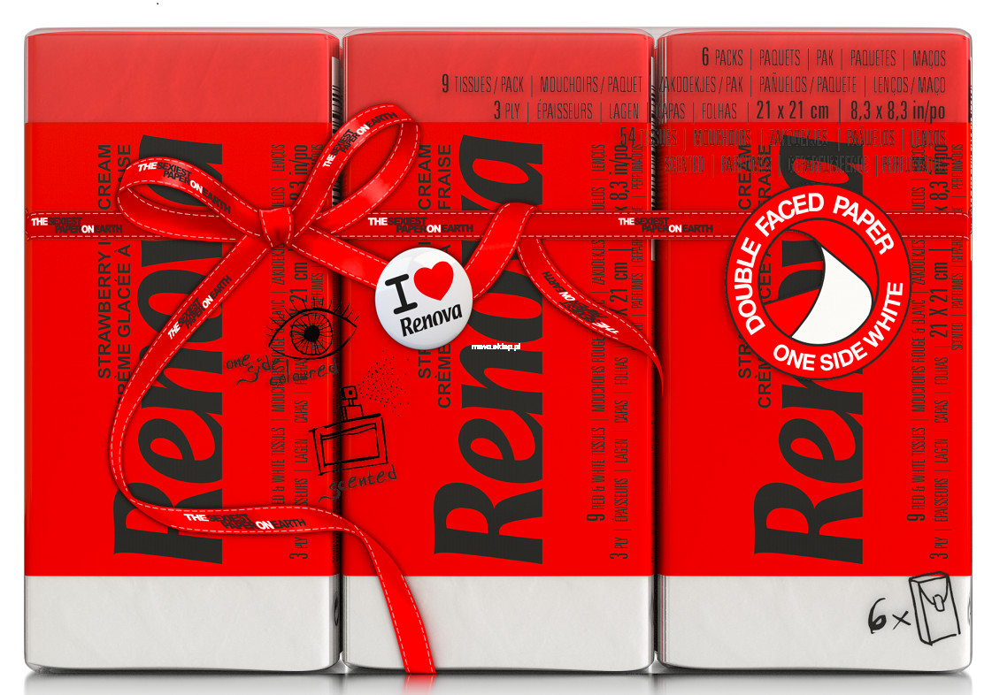 Każda chusteczka posiada dwa oblicza — od zewnętrznej strony czerwona a od wewnętrznej biała. Zbudowane z trzech warstw papieru posiadają zapach pysznych letnich lodów truskawkowych. Pokaż swoje prawdziwe oblicze.