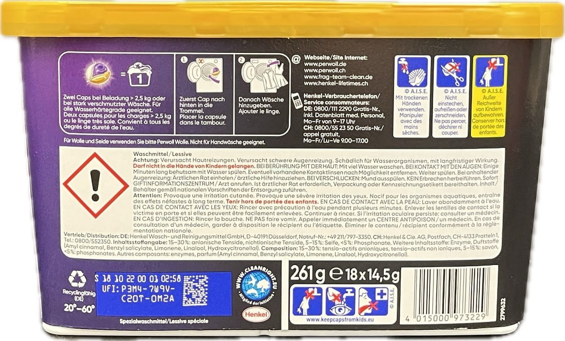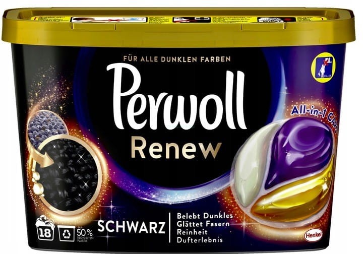 Perwoll Renew & Care Caps to niemieckie kapsułki do prania czarnych ubrań. Specjalna formuła kapsułek Perwoll została stworzona w taki sposób, aby chronić cazrne barwy ubrań i tkanin. Kapsułki Perwoll pozwalają na wygładzanie włókien dzięki specjalnym olejom zawartym w ich składzie. Po wypraniu tkaniny będą zadbane i wypielęgnowane. W opakowaniu jest 18 kapsułek.