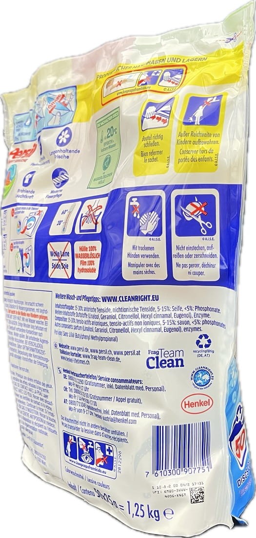 Kapsułki do prania tkanin białych i jasne kolory z funkcją usuwania nieprzyjemnych zapachów. Zakres temperatur 20-95 C. Nie stosować do wełny i jedwabiu. Nie stosować do prania ręcznego. Przechowywać z dala od dzieci. Dotykać suchymi dłońmi, nie przekłuwać. Sposób użycia: kapsułkę umieścić w bębnie pralki pod praniem.