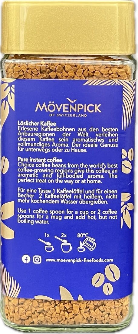 Aby cieszyć się pełnią smaku kawy Mövenpick Gold, wsyp jedną łyżeczkę kawy (około 2g) do filiżanki, zalej gorącą, ale nie wrzącą wodą (około 90°C) i delikatnie wymieszaj. Możesz dodać mleko lub cukier według własnych preferencji.