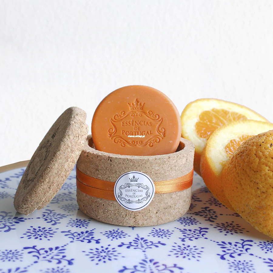 Naturalne portugalskie mydło o zapachu pomarańczy w ekologiczne korkowe pudełko. Surowiec opakowania 'korek' to słynny produkt z Portugalii, który nie tylko służy do zamykania najlepszych szampanów na świecie, ale też zabezpiecza i utrzymuje naturalny zapach mydeł Essencias de Portugal. Stylowego opakowania na pewno nie zamkniesz w szafce — będzie ozdabiać przestrzeń Twojej łazienki. Po zużyciu mydła opakowanie przyda się do przechowywania cennych drobiazgów.