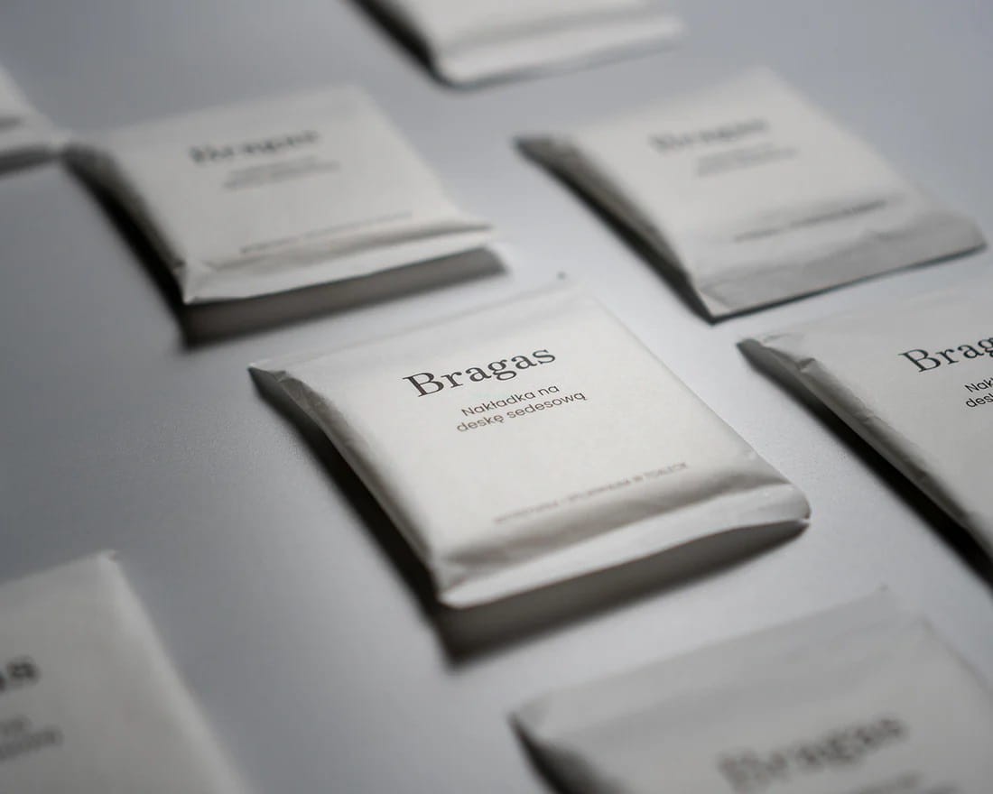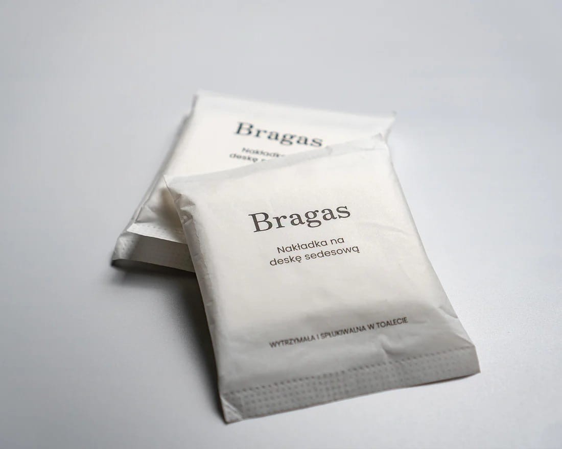 Nakładki Bragas wykonane są z autorskiej folii ekopolimerowej, zawierającej biodegradowalne i nietoksyczne składniki, takie jak kwasy tłuszczowe, gliceryna oraz alkohol poliwinylowy. Nie zawierają klejów ani tworzyw sztucznych, co czyni je przyjaznymi dla środowiska.