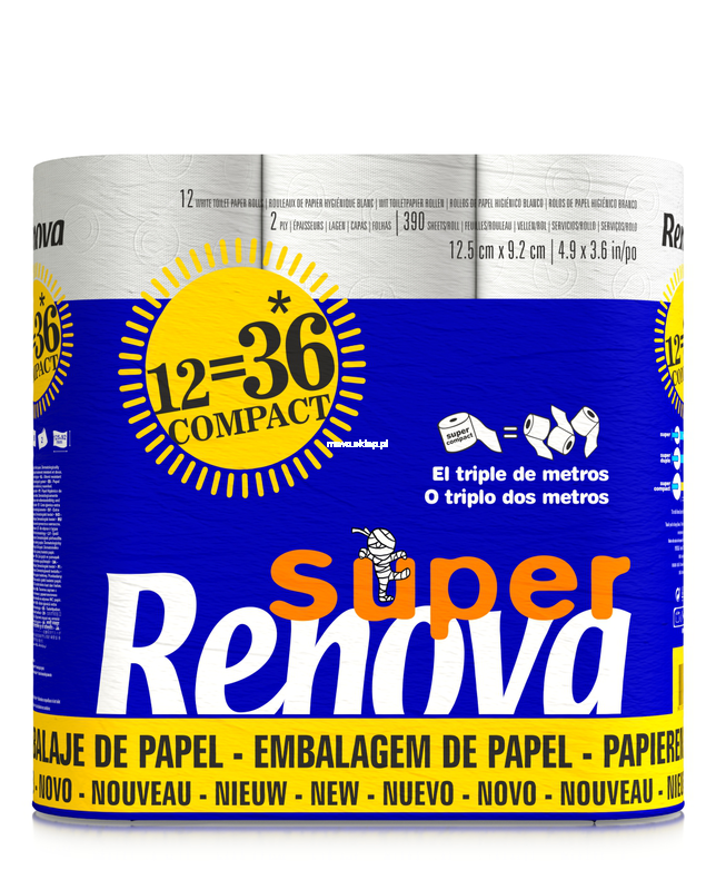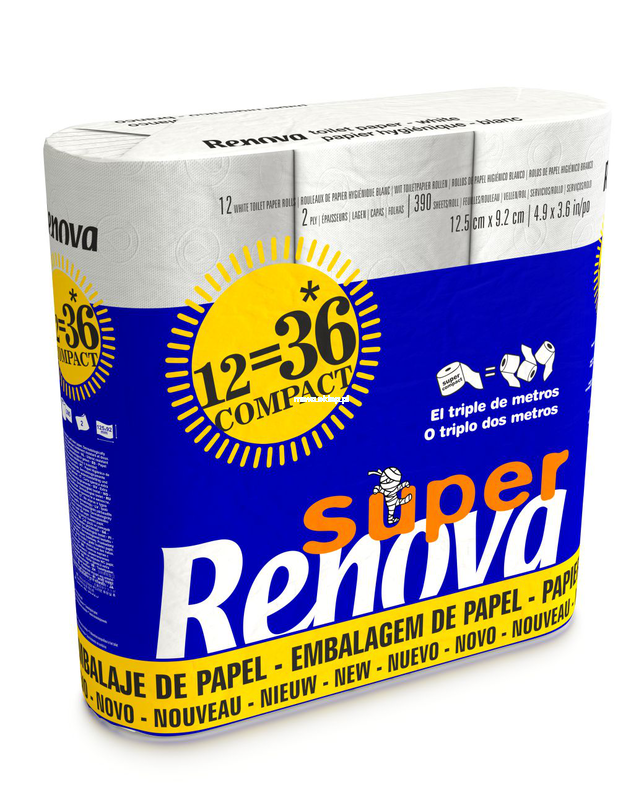 Klasyczna Renova Super, którą zawsze znaliśmy, teraz opakowana w papier: prostota i zaangażowanie w ochronę środowiska. 12 rolek o równowartości 36 rolek.
