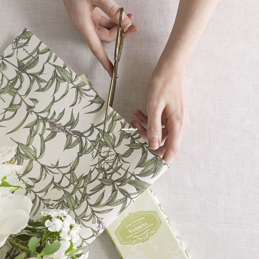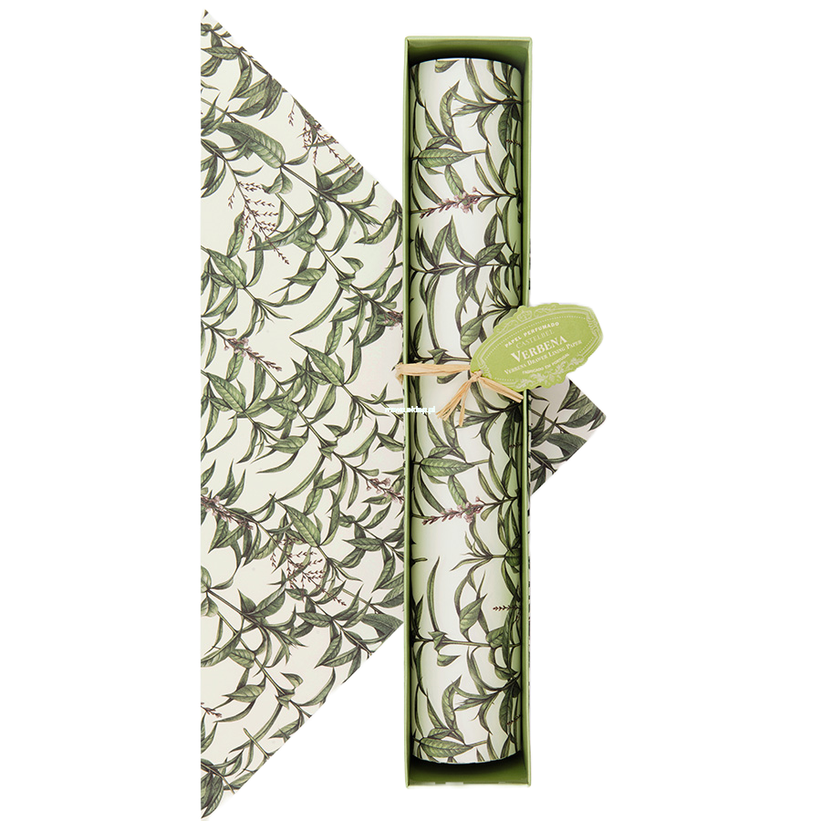 Wyjątkowy papier ozdobny do szuflad czy szaf. Niektórzy używają go również do okładania zeszytów, przygotowania zaproszeń na ślub czy pakowania drobnych prezentów. Jego wyjątkowość polega na delikatnym zapachu werbeny, który przeniknie do np. ubrań poskładanych w szufladzie. Perfumy nie są odparowywane na zadrukowanym papierze, tylko wymieszane razem ze specjalnym tuszem, dzięki czemu zapach jest trwalszy.