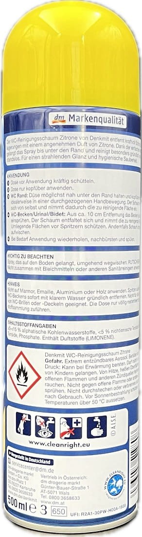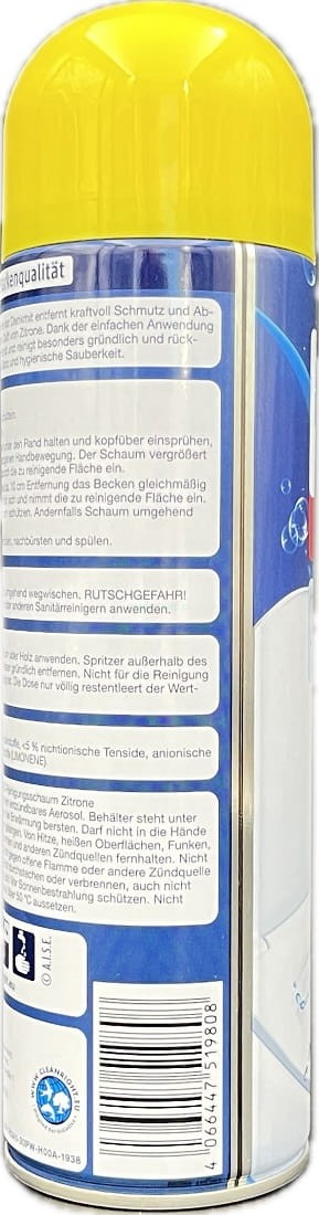 Pianka w sprayu o świeżym zapachu do czyszczenia toalety. Usuwa kamień. Łatwa w użyciu, nadaje połysk. Chroni przed nieprzyjemnymi zapachami i zabrudzeniami.