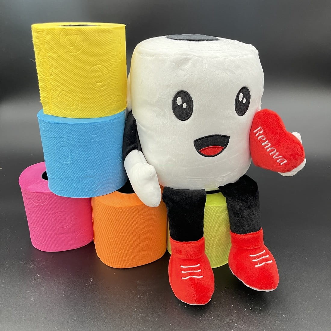 Maskotka dla dzieci w kształcie rolki papieru toaletowego. Maskotka trzyma serduszko z napisem Renova.