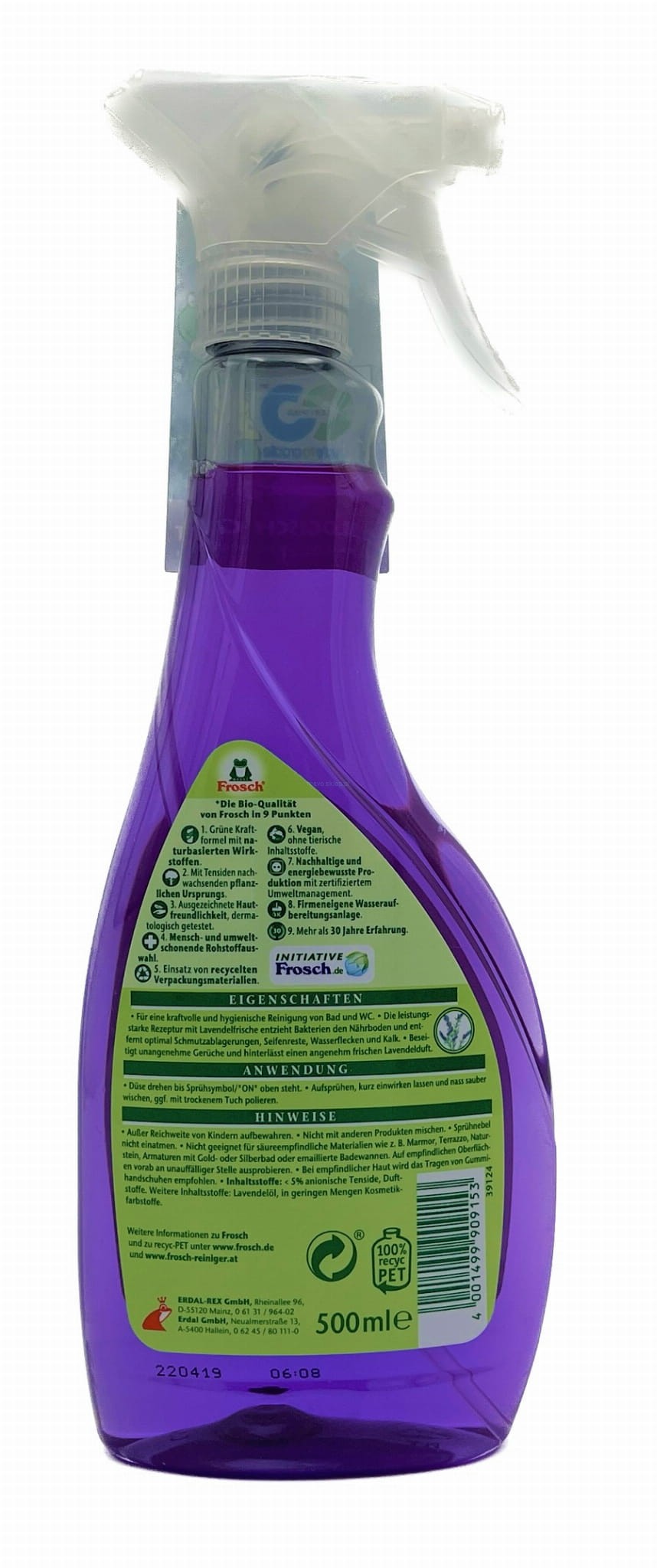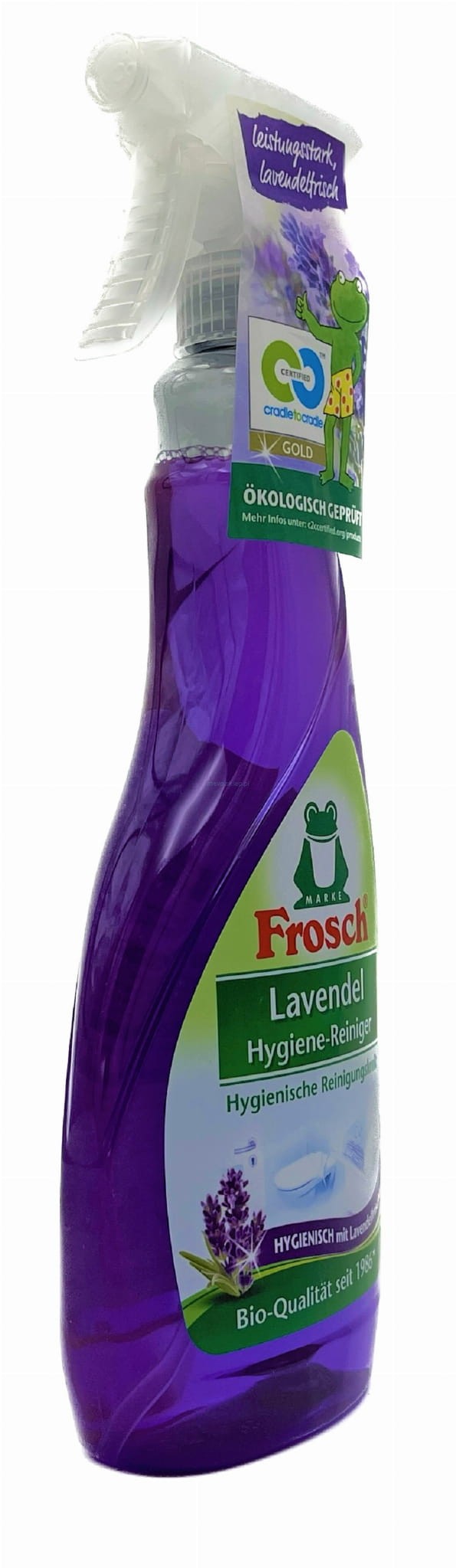 Płyn do higieny Frosch Lavendel Hygiene, usuwa alergeny i pożywki bakteryjne. Do higienicznego czyszczenia łazienki i toalety o świeżym zapachu lawendy. Produkt wegański. Opakowanie zawiera co najmniej 70% materiałów pochodzących z recyklingu.