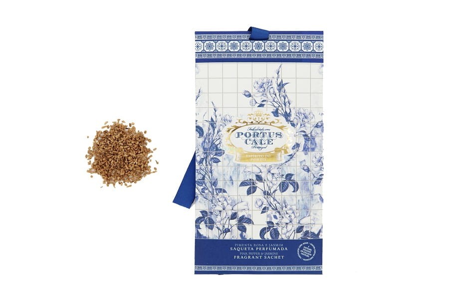 Pachnąca saszetka Portus Cale Gold & Blue to najwygodniejszy sposób, aby Twoja szafa pachniała Różowym Pieprzem i Jaśminem! Dzięki opracowanej technologii ta pachnąca saszetka Portus Cale Gold & Blue jest wypełniona światowej sławy portugalskim korkiem, który pozwala na powolne uwalnianie perfum, a tym samym na długotrwały aromat. Dzięki satynowej wstążce można go zawiesić w szafie, schować w szufladach i walizkach, a nawet powiesić w samochodzie.