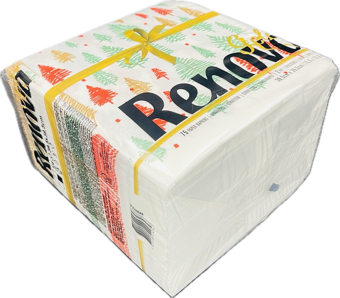 Serwetki premium Renova Gold, z białego papieru o specjalnej fakturze i wymiarach, ozdobione świątecznymi dekoracjami.
