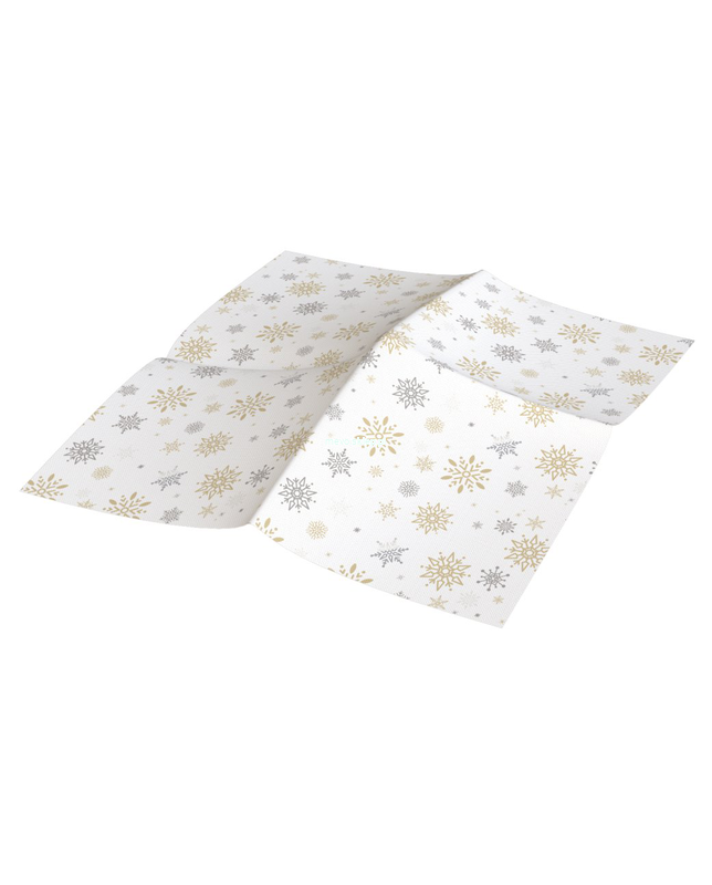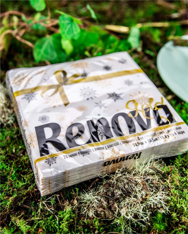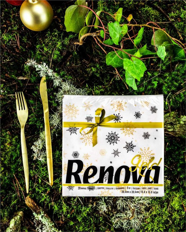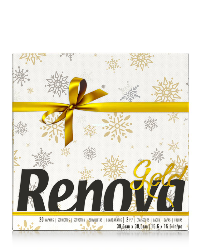 Serwetki premium Renova Gold, o białym papierze i specjalnej fakturze i wymiarach, zdobione świątecznie motywem płatków śniegu.