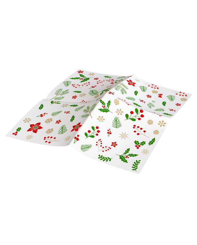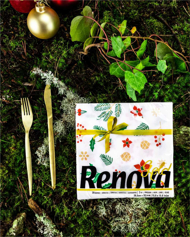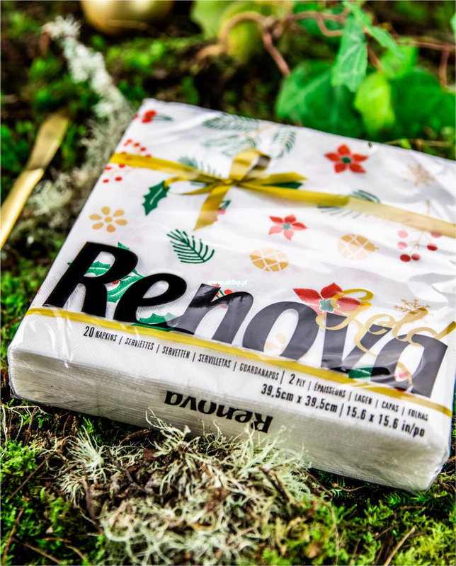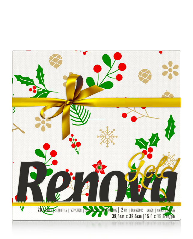 Serwetki premium Renova Gold, o białym papierze i specjalnej fakturze i wymiarach, zdobione świątecznie motywem ostrokrzewu.