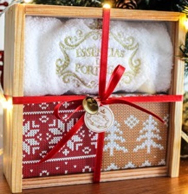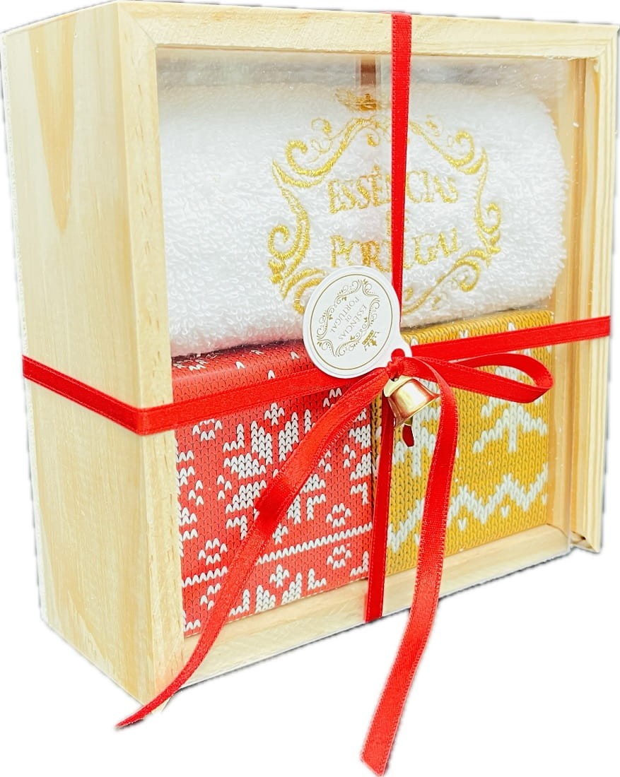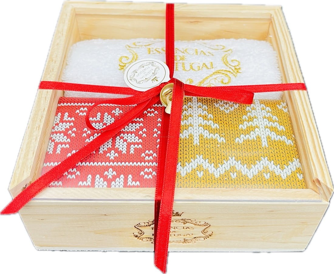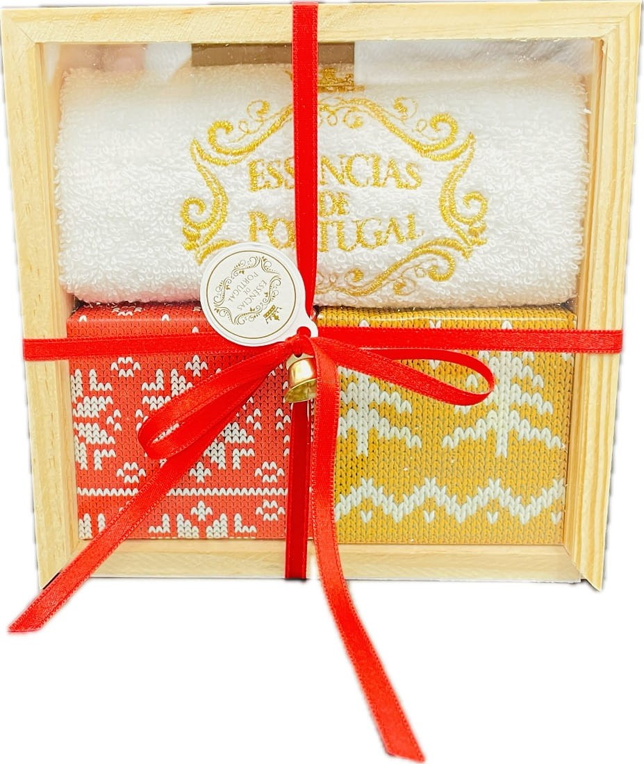 Pudełko z naturalnego drewna z sosny portugalskiej zostało ręcznie wykonane przez lokalnych stolarzy. Zestaw zawiera ręcznie haftowany portugalski ręcznik i dwa mydła z czystej oliwy z oliwek. Wyjątkowe połączenie, idealne, by zaskoczyć wyjątkowych ludzi.