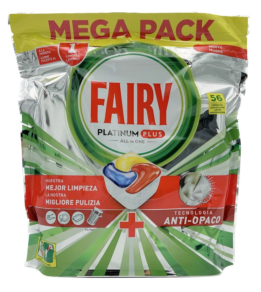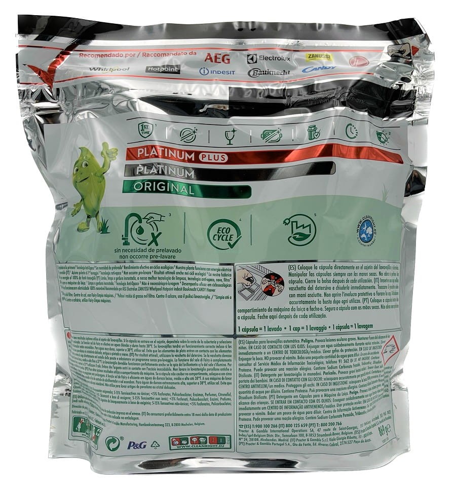 Tabletki do zmywarki Fairy Platinum Plus to połączenie płynu i proszku w jednej, skoncentrowanej kapsułce. Tabletki są skuteczne w programach krótkich i ekologicznych, a system wstępnego mycia umożliwia redukcję zużycia wody. Specjalna formuła nie tylko dokładnie czyści, usuwa brud, tłuszcz, ale także usuwa nagromadzony na naczyniach osad, dzięki czemu odzyskują dawny blask. Fairy Platinum Plus są proste w użyciu — tabletkę wystarczy umieścić w szufladce zmywarki. Posiadają zapach cytrynowy.