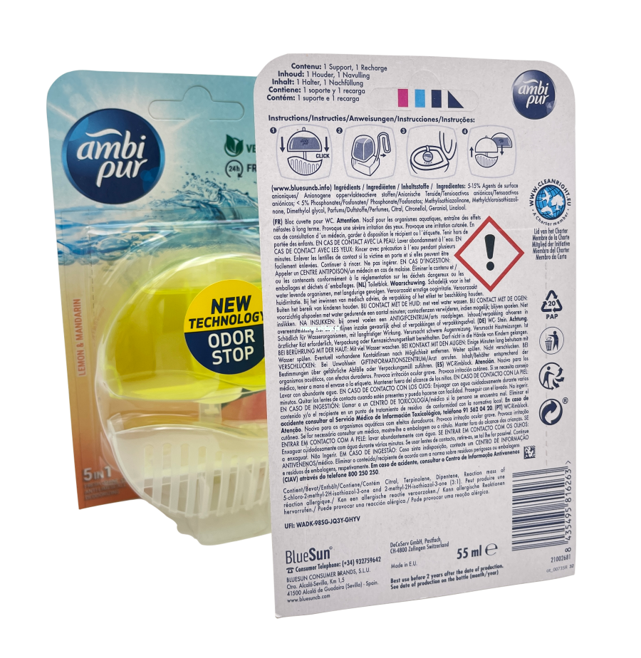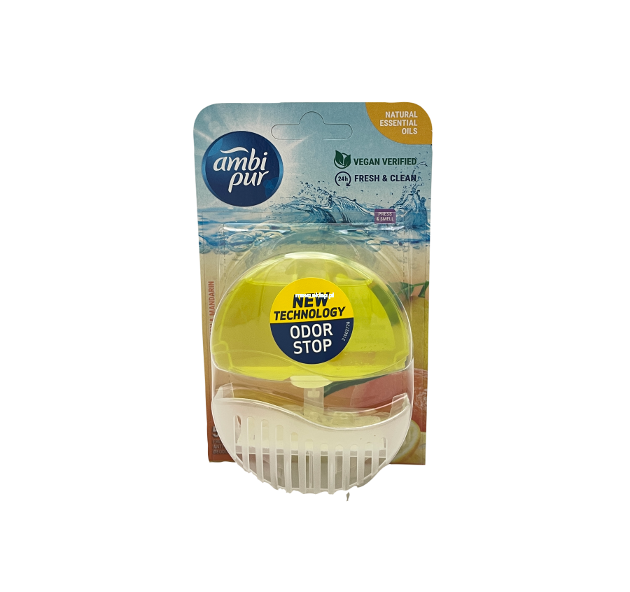 Ambi Pur lemon & mandarin odświeża toaletę, zapewniając czystość oraz przyjemny, świeży zapach cytryny i mandarynki. Ambi Pur za każdym razem dozuje taką samą ilość zapachowego płynu, sprawiając, że Twoja toaleta jest świeża i pachnąca od pierwszego do ostatniego użycia. Zawiera skoncentrowany płynny środek czyszczący, który pomaga zapobiegać osadzaniu się kamienia. Pozostawia toaletę świeżą, błyszczącą, czystą i pachnącą. Ambi Pur jest łatwy i higieniczny w użyciu, ma bakteriobójcze działanie oraz długotrwały, orzeźwiający aromat. Produkt wegański, opakowanie zawiera wkład o pojemności 55 ml i zawieszkę do WC.