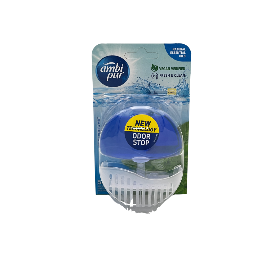 Ambi Pur Fresh Wather Mint odświeża toaletę, zapewniając higieniczną czystość oraz przyjemny, świeży zapach mięty wodnej. Ambi Pur za każdym razem dozuje taką samą ilość zapachowego płynu, sprawiając, że Twoja toaleta jest świeża i pachnąca od pierwszego do ostatniego użycia. Zawiera skoncentrowany płynny środek czyszczący, który pomaga zapobiegać osadzaniu się kamienia. Pozostawia toaletę świeżą, błyszczącą, czystą i pachnącą. Ambi Pur jest łatwy i higieniczny w użyciu, ma bakteriobójcze działanie oraz długotrwały, orzeźwiający aromat. Produkt wegański, opakowanie zawiera wkład o pojemności 55 ml i zawieszkę do WC.