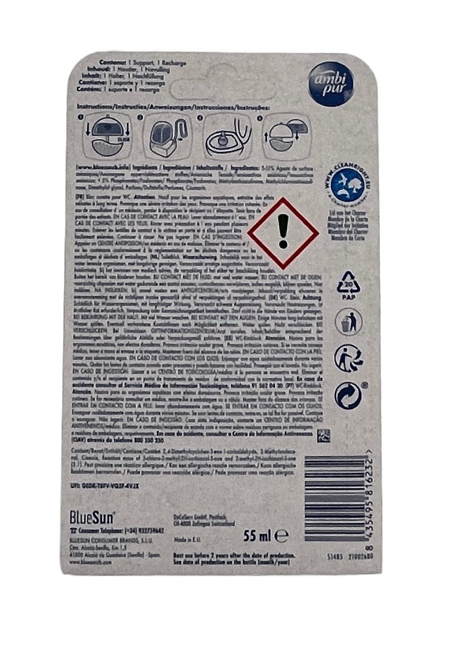Ambi Pur Vegan Tea Tree Pine odświeża toaletę, zapewniając czystość oraz przyjemny, świeży zapach herbaty i sosny. Ambi Pur za każdym razem dozuje taką samą ilość zapachowego płynu, sprawiając, że Twoja toaleta jest świeża i pachnąca od pierwszego do ostatniego użycia. Zawiera skoncentrowany płynny środek czyszczący, który pomaga zapobiegać osadzaniu się kamienia. Pozostawia toaletę świeżą, błyszczącą, czystą i pachnącą. Ambi Pur jest łatwy i higieniczny w użyciu, ma bakteriobójcze działanie oraz długotrwały, orzeźwiający aromat. Produkt wegański, opakowanie zawiera wkład o pojemności 55 ml i zawieszkę do WC.