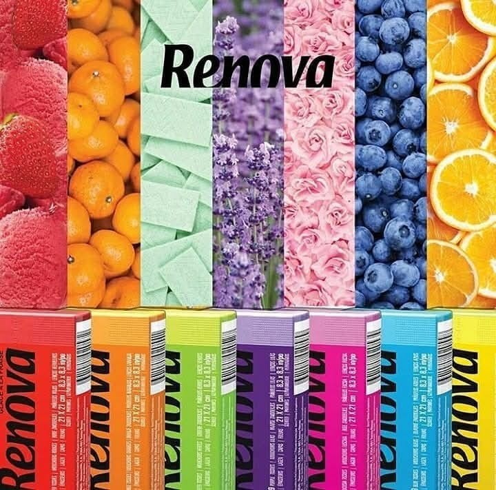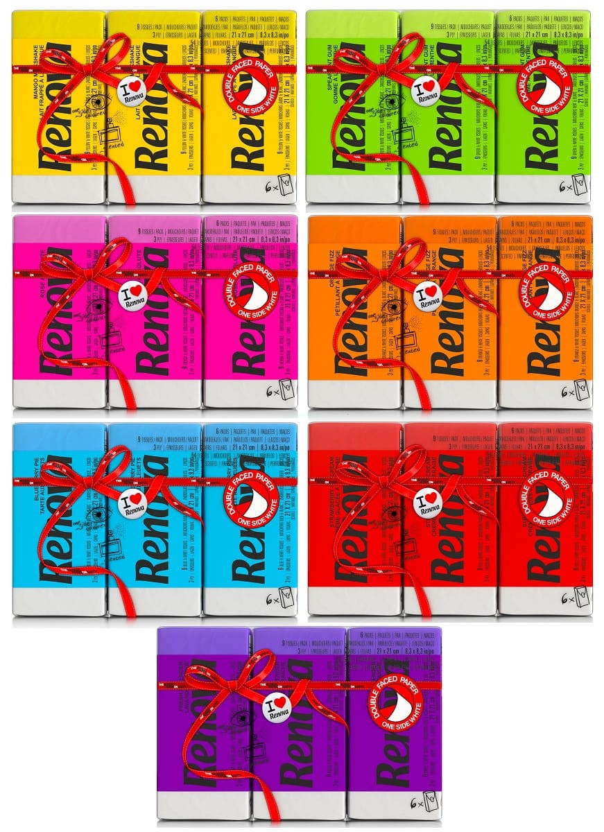 Zestaw obejmuje 7 opakowań chusteczek Renova 6*9 szt — każde w innym kolorze: