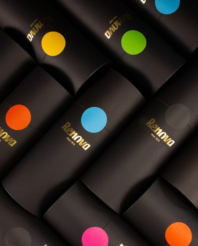 Piękne, soczyste, ponadczasowe kolory zieleni niczym trawnik w ogrodzie, rolki papieru toaletowego dostępne w specjalnej edycji prezentowej – czarnej matowej tubie, ze złotym napisem Renova. To wszystko przypieczętowane okrągłą naklejką w kolorze papieru.