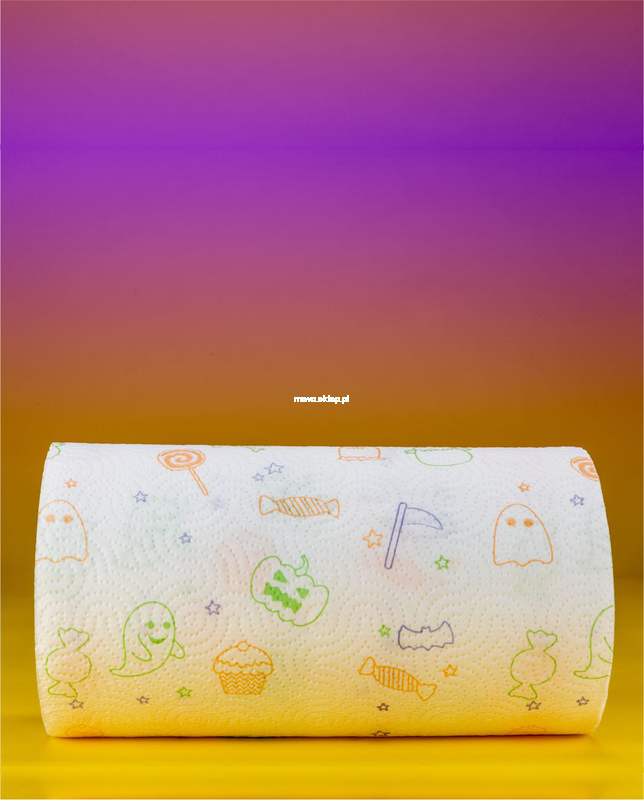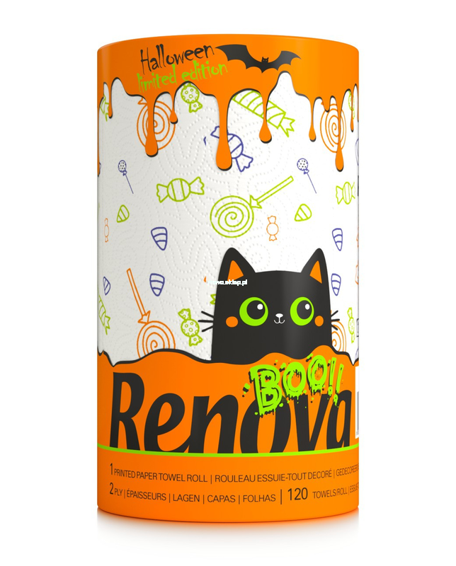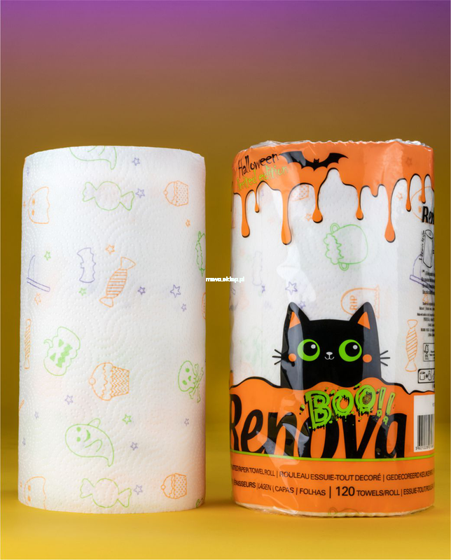 - Ręcznik papierowy Renova Halloween Edition 1R – biały papier z nadrukami Halloween, 2 warstwy, 120 arkuszy, 27,4 m, format XXL.