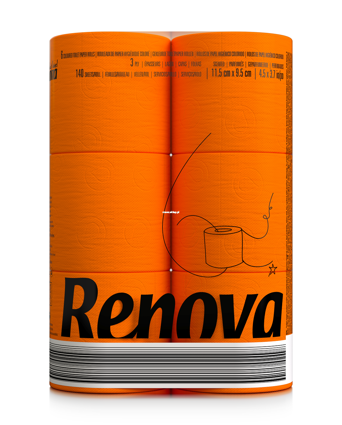 - Papier toaletowy Renova pomarańczowy 6R – 3-warstwowy, delikatnie pachnący, bardzo miękki i chłonny, 140 listków i 16,1 m na rolkę.
